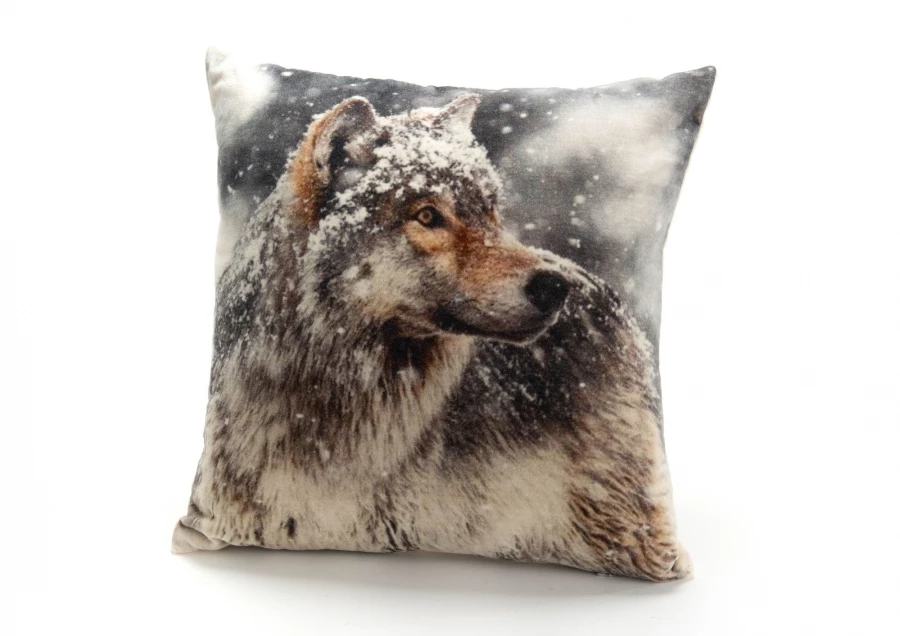 Très tendance les représentations de faune sauvage en décoration. Voici les coussins d’un magnifique loup en hiver.
