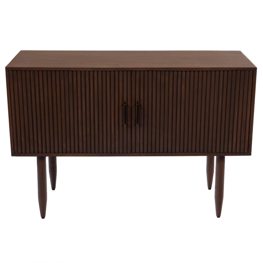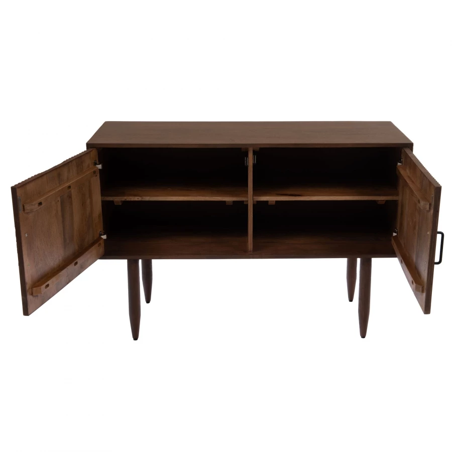Ce buffet bas est entièrement réalisé en bois de manguier teinté foncé. Ce meuble propose 2 portes joliment travaillées ouvrant sur 2 étagères et donc 4 casiers de rangement.