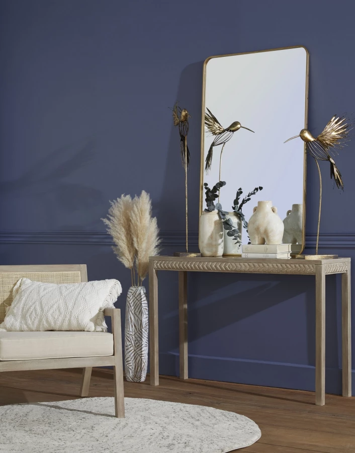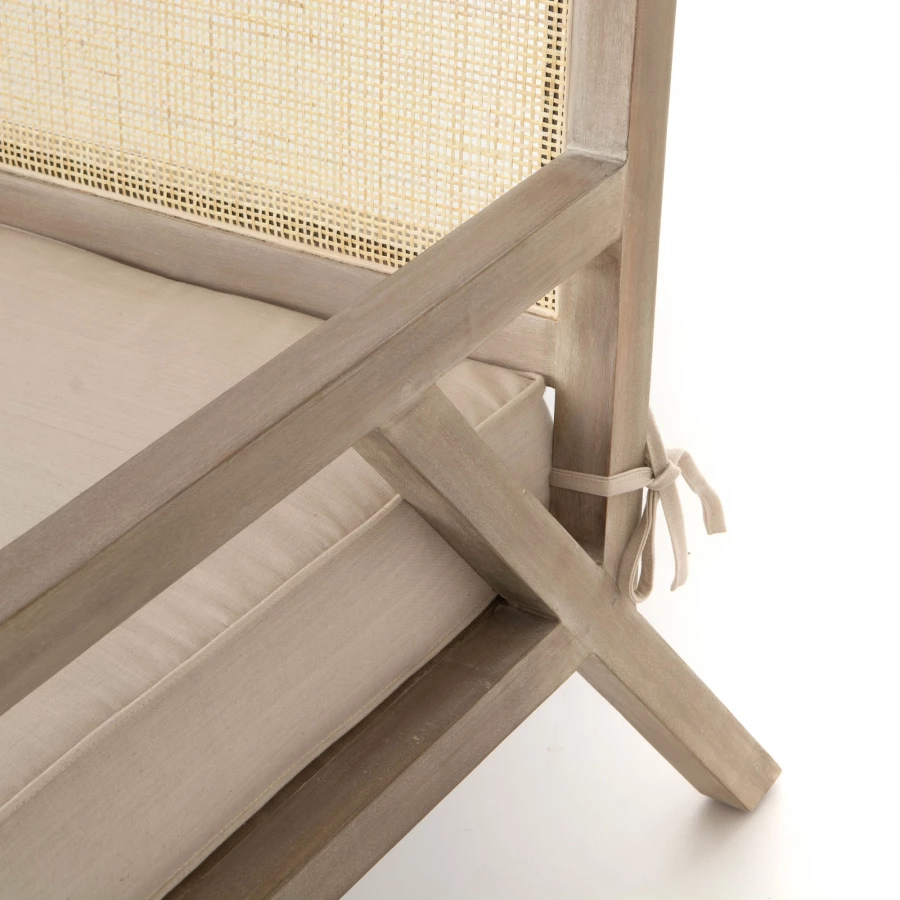 Très chic fauteuil de la collection Inspiration réalisé avec un piètement en bois et habillé d’un coussin en tissu couleur naturelle pour l’assise et de cannage en rotin naturel pour le dossier.