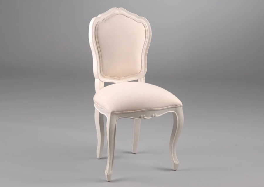 Très belle chaise bien travaillée en bois couleur crème antique, assise et dossier très confortable en tissu.