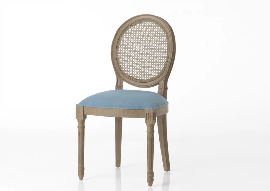 Nouvelle collection de chaise forme médaillon en bois patiné et dossier canné.