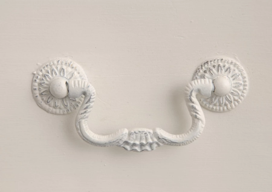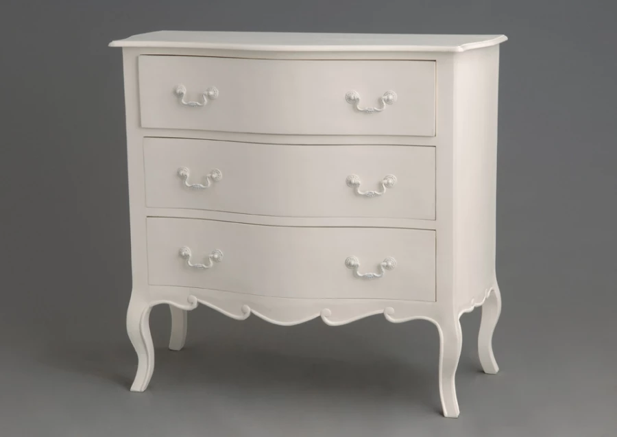 Commode légèrement galbée en acajou de couleur crème antique comprenant 3 tiroirs.