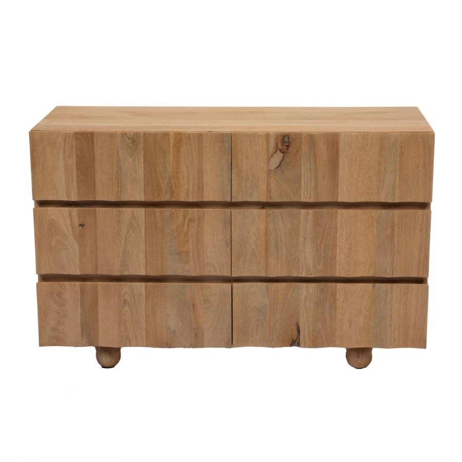 Cette commode est entièrement réalisée en bois naturel avec un piètement 4 pieds ronds et proposant 6 tiroirs.