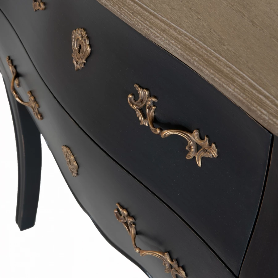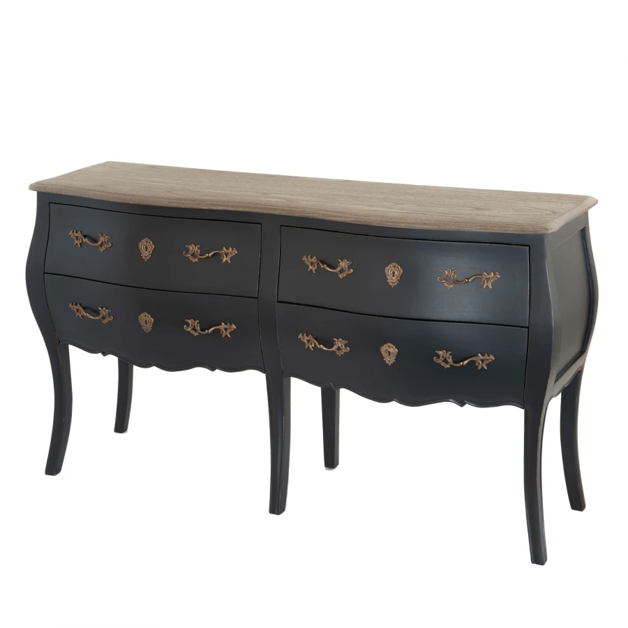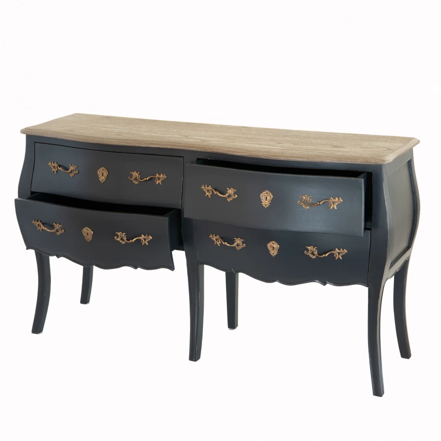 Cette commode est pourvue de 4 grands tiroirs, sa patine est gris/noir et plateau naturel.