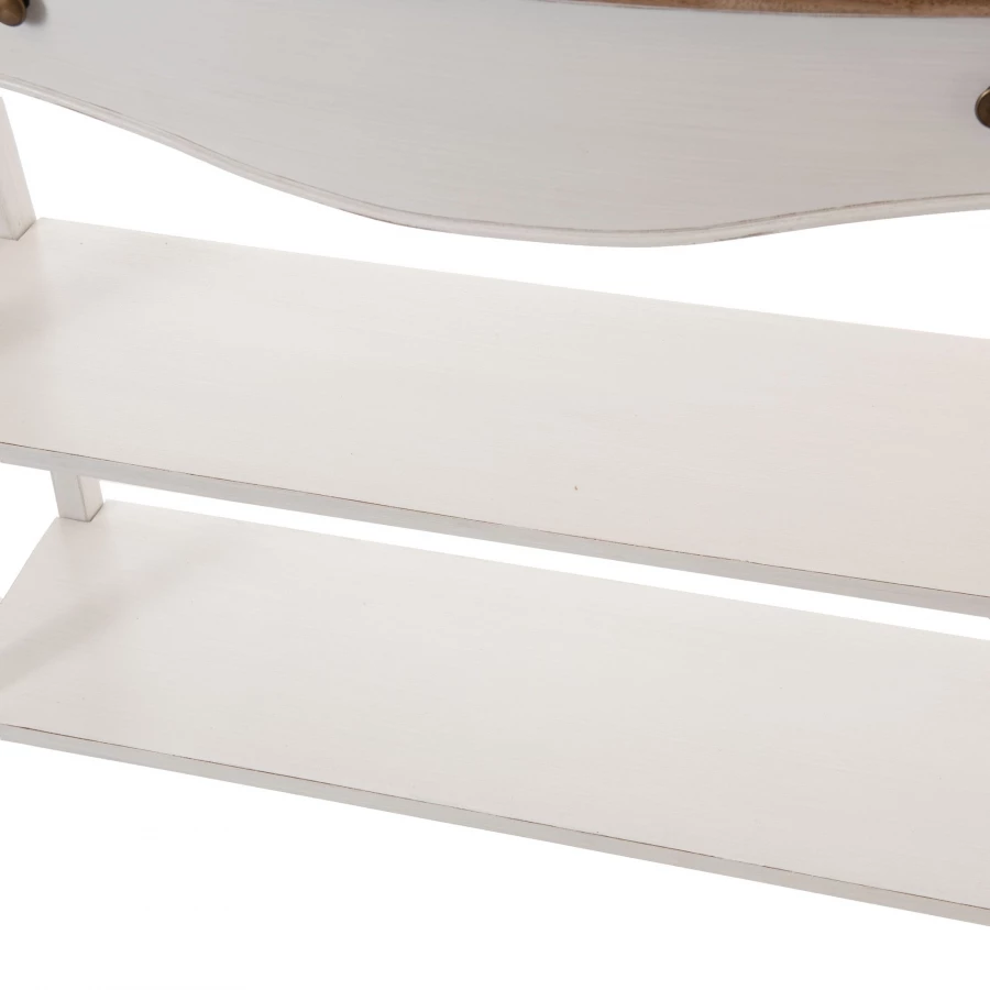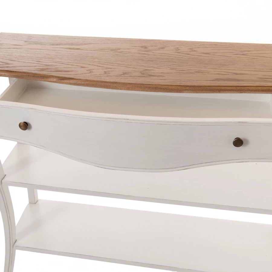 Réalisée avec un piètement blanc, habillée d’un plateau en placage chêne, cette console propose 1 tiroir pour le rangement ainsi que 2 étagères.