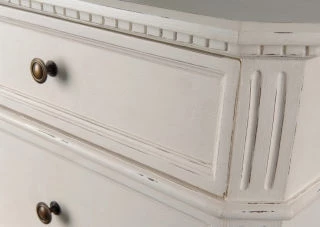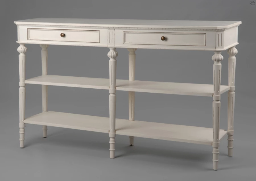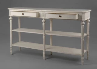 Console drapier en bois blanc de la collection Leonie avec empiètement 6 pieds. Cete console est pourvue de 2 tiroirs & 2 étagères.