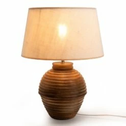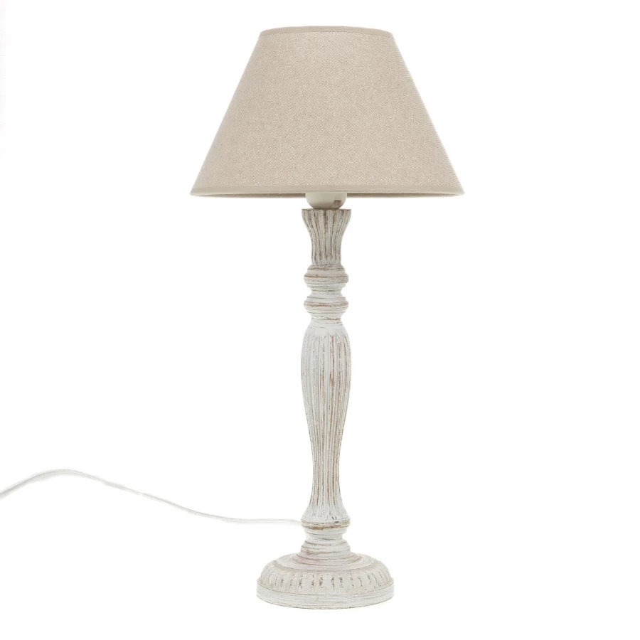 Lampe très élégante réalisée avec un pied bois joliment travaillé et patiné blanc. Ce pied est habillé d’un abat-jour rond en tissu lin naturel.