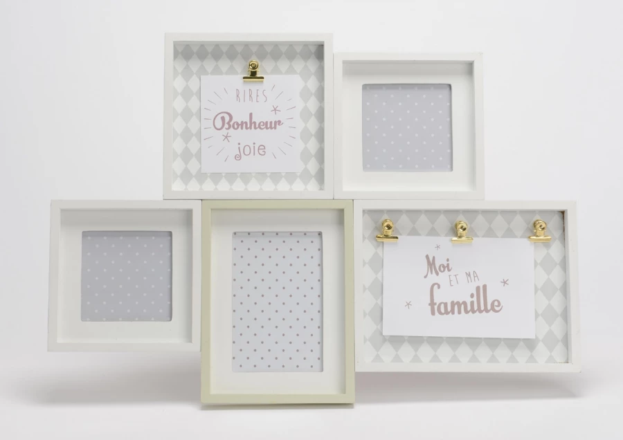 Pèle-mêle de 5 cadres photos en bois. Prévu pour photos de différentes dimensions.