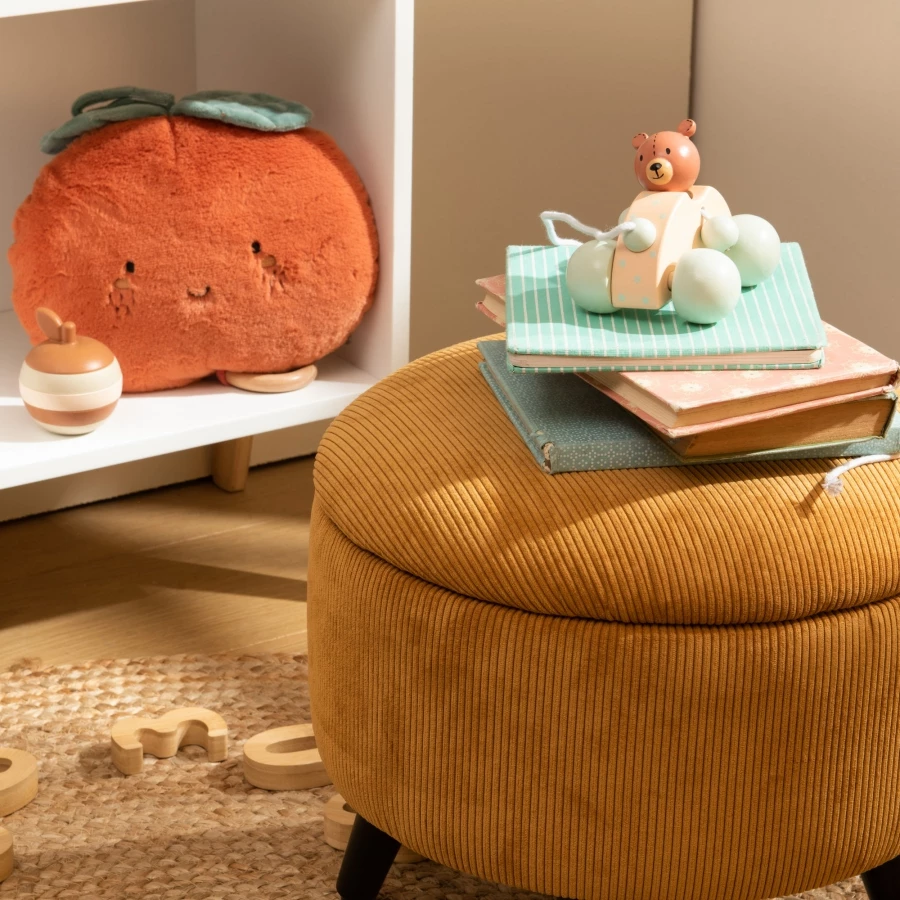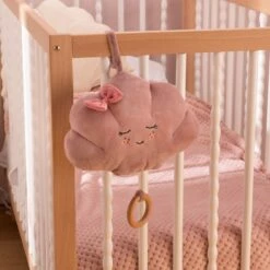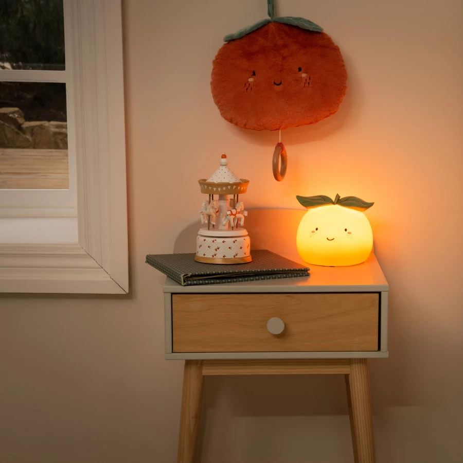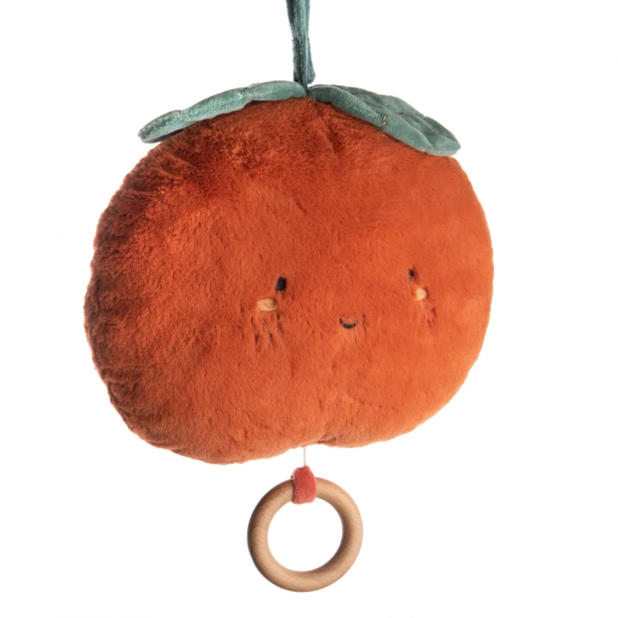 Jolie et très colorée orange doudou à suspendre au lit par exemple ou à poser, elle diffusera de la musique douce pour endormir bébé grâce à sa tirette cordelette.