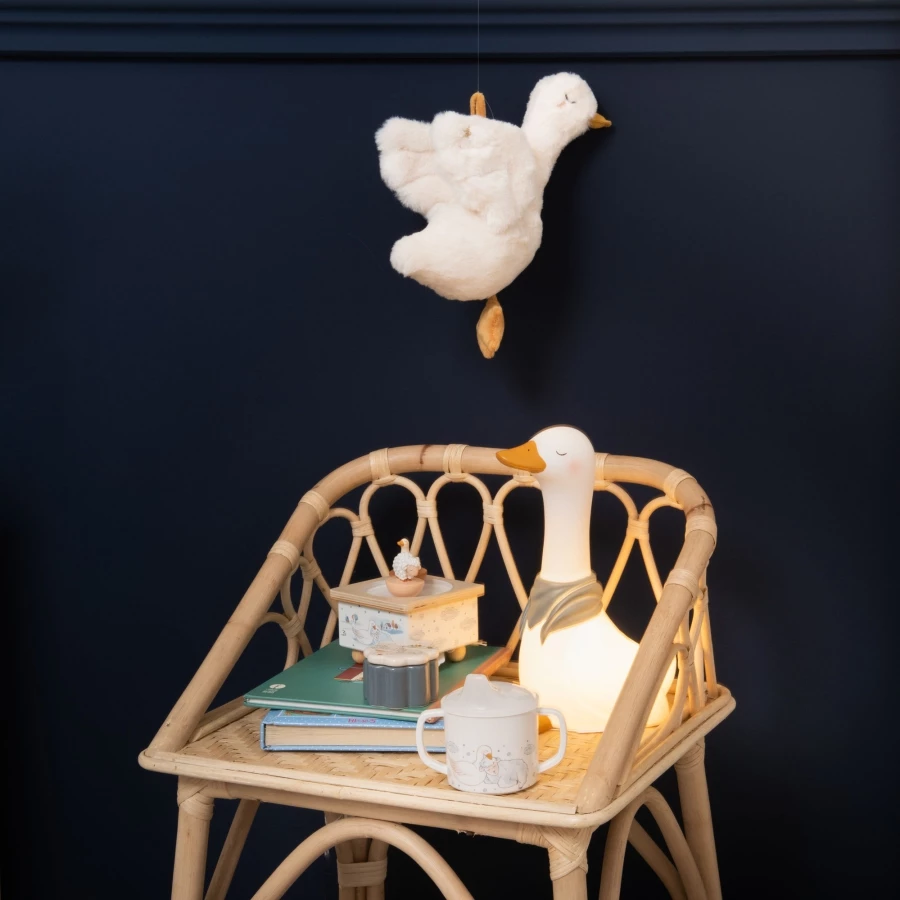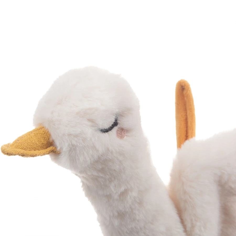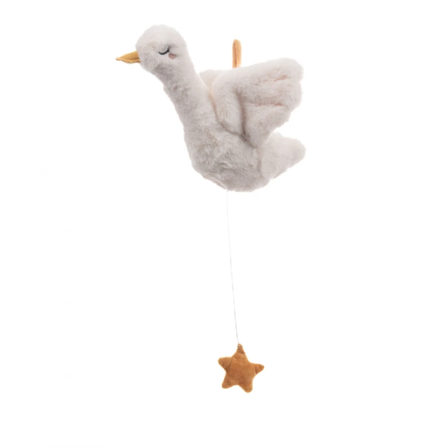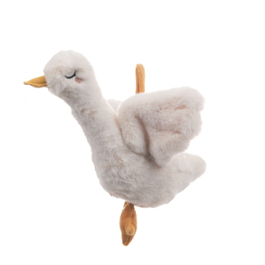 Jolie petite oie doudou à suspendre au lit par exemple, elle diffusera de la musique douce pour endormir bébé grâce à sa tirette cordelette.