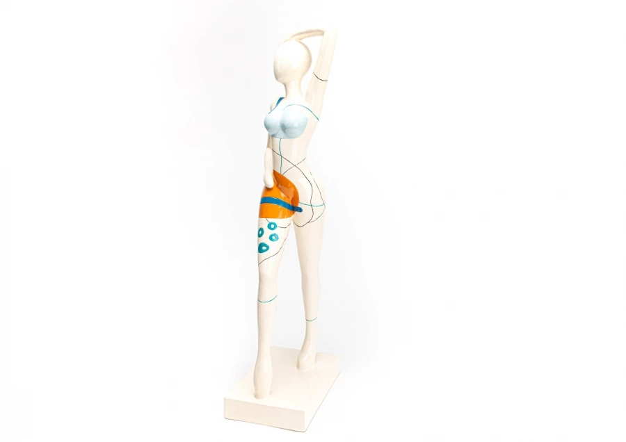 Belle statue de femme en position debout, vétue de couleurs très festives