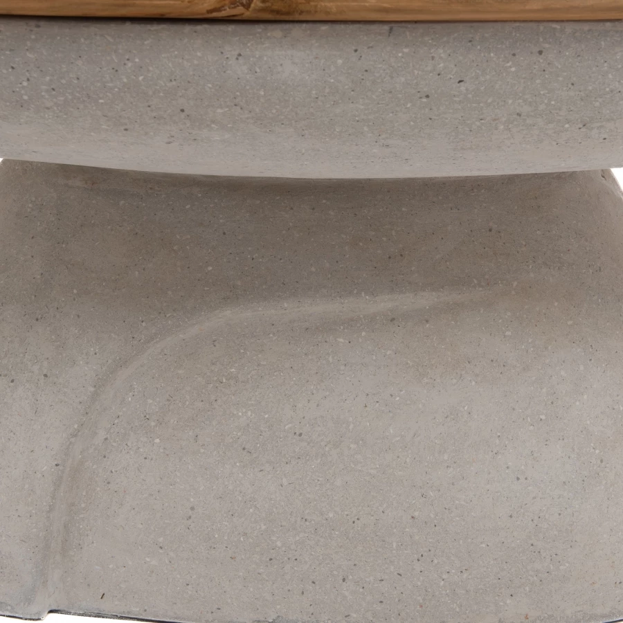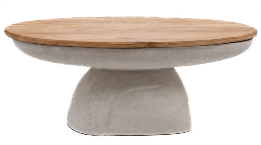 Cette table basse de salon de forme ovale est réalisée avec un piètement ovale travaillé + soubassement réalisé en composite imitation ciment et habillée d’un plateau ovale en bois de Teck naturel.