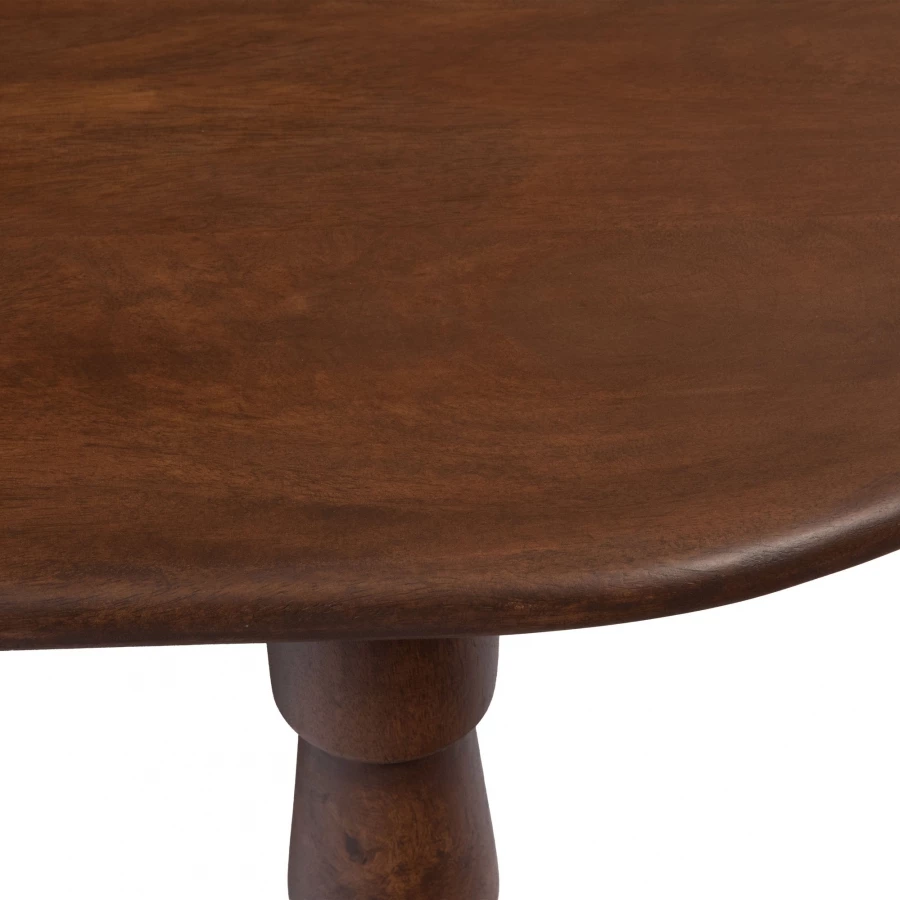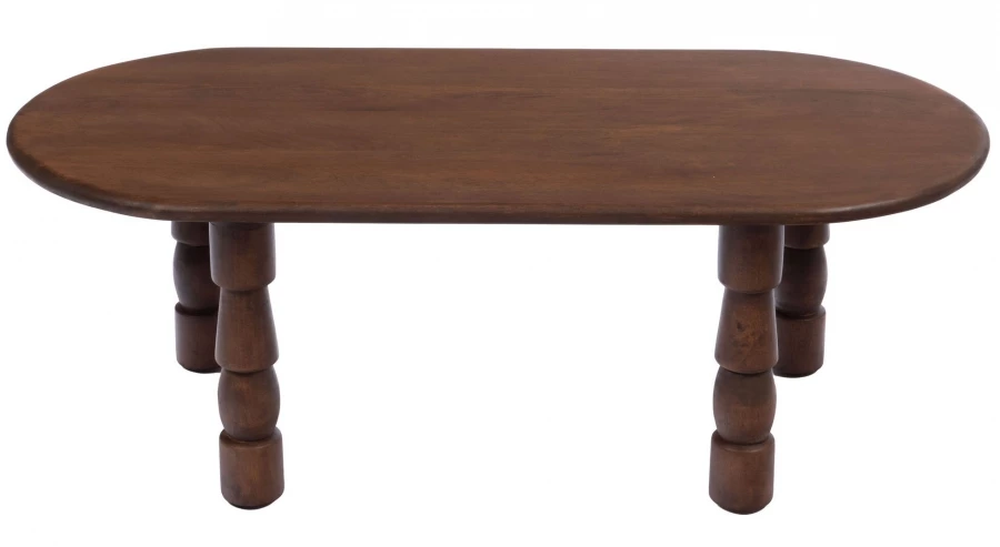 Cette table basse ovale de salon est entièrement réalisée en bois de manguier teinté foncé avec un piètement 4 pieds très originaux.