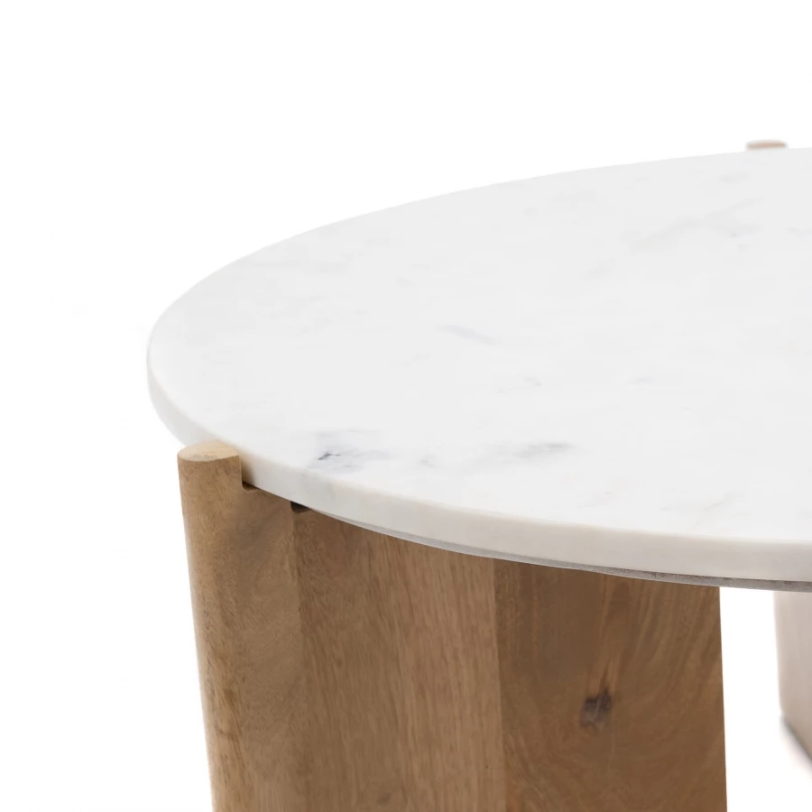 Les matières naturelles se fondent. Cette petite table basse ronde est réalisée avec un piètement 3 pieds en bois naturel et est habillée d’un plateau rond en marbre blanc.