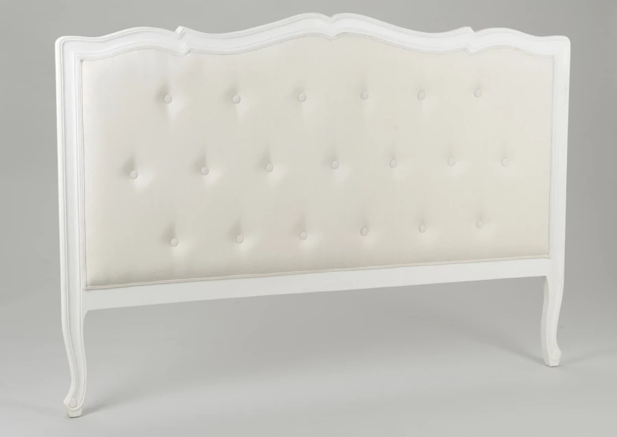 Très chic tête de lit en bois blanc et habillage tissu dans un style deco campagne chic.